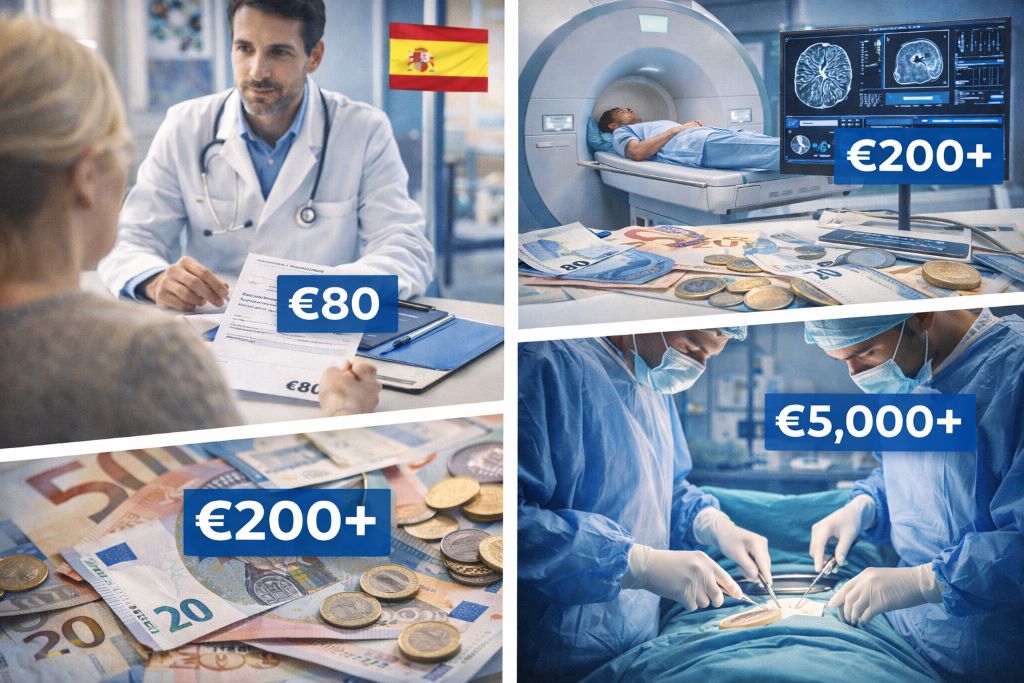 В Испании расходы сильно различаются в зависимости от того, пользуетесь ли вы государственной системой SNS (обычно бесплатно при наличии права) или частной медициной (оплата из кармана или по страховке). В SNS чаще всего платят только за часть лекарств по рецепту (ко-пей), а приёмы/госпитализация/операции при наличии права обычно не оплачиваются напрямую.