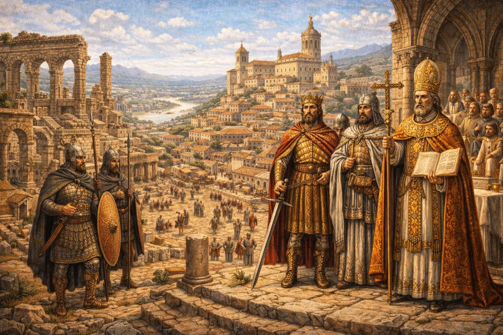 История вестготов в Испании занимает особое место между двумя большими эпохами — античностью и Средневековьем. После долгого периода римского господства Пиренейский полуостров начал постепенно меняться под влиянием кризиса Западной Римской империи. В V веке на его территории усилились различные варварские народы, и именно вестготы со временем сумели создать здесь наиболее прочное государство. Их эпоха стала переходным этапом: античный мир ещё не исчез полностью, но уже складывались новые политические, религиозные и социальные порядки.